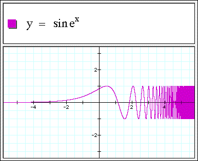 Graphing Calculator uses interval arithmetic methods to graph functions robustly. In this example, the function is oscillating very quickly on the right. Using interval methods Graphing Calculator draws this as a solid band, rather than aliasing when the function has features smaller than a pixel.
