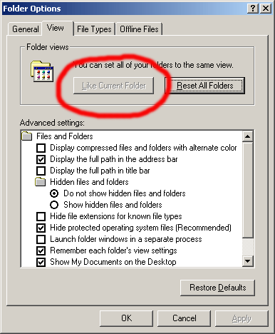Windows 2000 question. I want all folders to open in Details view mode. I tried using the Folder Options control panel, but the Like Current Folder button is always grayed. How do I get it enabled? And am I approaching this the right way? [Lawrence Lee has the answer: "Try opening Folder Options from the menu bar while viewing the folder instead of from the Folder Options applet in the control panel." Thanks!]