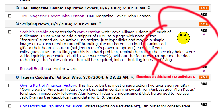 Monday, August 02, 2004Rick Klau: "All politics is RSS." Amen.  Radio UserLand has a product manager. Hey how about that. And he's already on the job. I use Radio, using it right now to write this post. I was planning on fixing some bugs. Steve Kirks is a good guy. A true believer.   Dan Bricklin's response to Charles Cooper re blogging in Boston.   BTW, now that Dan has an RSS feed, I never miss one of his posts.   Two interesting letters to the editor of News.Com about bloggers.  Happiness is more feeds from NPR.