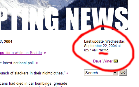 Monday, September 13, 2004A brief audio blog post in response to Adam's Daily Source Code.  Who do I talk with at the Seattle Times and/or Post-Intelligencer about getting some RSS feeds going? In Boston, I didn't feel like I was part of the community until the Boston Globe had feeds.   Ooops, the Seattle Post-Intelligencer has feeds.   P-I: "Fallujah offers a stark example of what's gone wrong in Iraq."  Josh Marshall: "The president's campaign has managed to take Iraq out of the election debate."  Scott Rosenberg: "Bush has managed to distract the nation from the essential rudderlessness of his leadership."  The Election Protection coalition "needs you to stand up and defend voting rights on November 2."  Today at breakfast I shared a table with a Republican from Alaska named Dave. We agreed that we have to work together after the election, no matter who wins. I'd like to hear from other Americans who feel that way.   David Appell: "Should the storm reach landfall in New Orleans, that city could be in for a world of hurt unlike anything it’s seen in modern times."  Finally, the Democrats are insisting that the Republicans explain how the war in Iraq is related to the "War On Terrorism." This is a much bigger deal than whether Bush served in Vietnam. It's also far more serious than the lie Clinton got impeached for. This is like shooting ducks in a barrel.  Hacking Netflix on the new-releases-at-Netflix feed.  Adam Curry looks at doing a VOIP-based radio show.   Yesterday I heard a really interesting segment of the NPR show American Routes on the founding of Atlantic Records.  Scott Koon offers a Seattle survival guide. "God hates the eastside."  I've gotten a fair number of questions of what I think about the bloggers digging into CBS with evidence and conjecture about the authenticity of the memos about George Bush's national guard service. I wanted to figure out what I had to say first, before saying it. So here goes. 1. That bloggers are great and powerful news breakers and fact-checkers is no news to me, or to readers of this blog. Reminds me of the time, four years ago, when it was discovered that AOL Time-Warner was running an MP3 search engine that was even easier to use than Napster, at the same time as suing Napster along with the other RIAA companies. I had to virtually beat Ryan Tate at Upside over the head to get him to pick up the story and run with it. The day after he did, the Wall Street Journal picked it up, with full credit to Ryan, and none to us. I took several deep breaths and muttered "it doesn't matter" about 18 dozen times. 1a. And then there was Trent Lott. Remember him? 2. It also reminds me of the time Chris Lydon said at a Berkman Thursday meeting, that because Dick Morris, a sleazebag Democrat operator, had recognized the power of blogs, that we had won, game over, throw a party, etc. I said to Chris, I'm not doing what I do to get approval from scum like Dick Morris. In fact, if anything, I'm doing it to get rid of scum like Dick Morris, or at least develop a political process that empowers everyone but scum like Dick Morris. 3. Even blogs aren't as important as choosing the best president in 2004. If that's the only thing we accomplish with all our work over all these years, it would have been worth it. If blogs correctly tell the story of the end of the world, we didn't win. 4. The latest we-fact-check-your-ass story was about an irrelevant detail of an irrelevant issue. Come on guys and gals, there's a real story out there. Which one of these losers should we bet our future on? Hint: It's even worse than it appears. In the upper right corner of this page there's a pretty important piece of text that says what time the blog was last updated. Right now it says: "Monday, September 13, 2004 at 4:22 AM Eastern," which is accurate, but it doesn't give you much of an idea of the temporal environment at the point of entry. In fact, in Seattle, where I am now as I write this, and as I will be for much of the remainder of 2004, it's now 1:29 AM Pacific." So the question is: Should I switch the message? We deal in the weighty issues of the day, and the minute issues of the day too. Service with a smile.