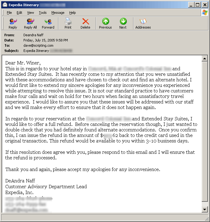 Meanwhile Scoble is getting some grief from ZDNet's David Berlind. I've gotten this kind of grief myself, and it's based on a big misunderstanding. I'd rather make a mistake and have it corrected within a few minutes, than spend two weeks researching something and still get it wrong, as most reporters do. Further, I don't have the two weeks, so the choice is to take a chance or not get the information at all. I'll always err on the side of taking a chance, and always add a grain of salt to everything you read here (and everywhere else for that matter). Now I understand what Scoble was saying when Michael Gartenberg was criticizing him. Scoble is doing the right thing. They should try to understand how he works, because it produces much better results than the system Gartenberg and Berlind are advocating. Demonstrably much better.   Expedia heard about the problem, and is working on it. Not sure if they read about it here, or if their internal systems uncovered the problem. I kind of hope it was the latter.   Two years ago, UserLand transferred the copyright in the RSS 2.0 spec to Berkman Center where it was re-published using the Creative Commons for-attribution share-alike license.  Jay Rosen: "The brutalizing of McClellan was no recovery of courage by a suddenly-awakened press.It was the Bush team’s bald assertiveness coming into conflict with truth collection in the criminal justice system, which has exposed a seamy story that journalists themselves would have kept hidden because it involves their confidential sources."