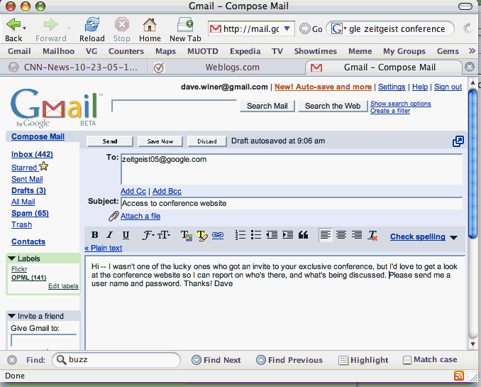 Sunday, October 23, 2005Listening to Meet the Press today, it's fairly clear that Karl Rove and others will be indicted. A Republican senator, Kay Bailey Hutchinson, was spinning like this: Innocent until proven guilty. She hopes the charges aren't perjury or obstruction of justice, the kind of charges (she says) that you file when you can't prove your primary case. Those also happen to be the charges that President Clinton was impeached on, funny how standards change, eh. Democrat Art Schumer said he would accept whatever the prosecutor decided to do. Sounds reasonable, if you assume he's not partisan, but of course everything he says is totally partisan. So he knows the indictments are coming. This week it was exceptionally easy to read the tea-leaves.  The conference website for this week's invite-only Google Zeitgeist conference. If you have a password for the site that you'd like to share, I'd love to take a look. Right now, it's closed. I also sent an email to Google asking for access to the site. Hey if you never ask they can never say yes. In her writeup, Sylvia Paull compares Friday's BBQ to early BMUG meetings. If Woz were there, he might compare it to the Homebrew club that met at Stanford in the early days of the PC. We all have our points of reference. To me, it was like the first BloggerCon. But all these events have something important in common, something that's very much like the web, they are inclusive and open to all. How ironic that a conference called Web 2.0 was invite-only. It's so un-weblike to say who can come and who can't. That's not what the web says. It says anyone can come. Even so, there is a price of admission. To get to the BBQ, or the Homebrew Club, BMUG or BloggerCon, you had to have a ride. To get on the web you have to have a computer and a net connection.