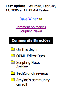 David Wilkinson has a mockup of an OPML Editor 1.0 website for review. It's a little homey, imho, I was hoping for more color, like the Firefox download site. Maybe even with rounded corners and Ajax-ish tech. I'm thinking about a series of OPML Roadshows in April, to take the 1.0 release around the U.S. to show it off. So far I've asked about venues in Cambridge, New York and Seattle. Obviously there would have to be one in the Bay Area. Maybe this time (I'm going to get in trouble for this) London. It was a rougher week on the net than you could see on the mail lists. I'm getting pushed around again, that's the bad news. The good news is that a bunch of people wanted to get a flamefest going with me as the guest of honor, and it didn't take root. Even so, I have reached a new level of exhaustion, and that's not a good thing. In some conversations, I've tried, to no avail, to explain that I am a real person, not an object, and I'm just asking to be treated as you would treat anyone else. But I'm also an A-lister, and a celebrity, and being treated like an object comes with the territory. But I'm also a blogger, and I'm sorry, I just doing go for the regal treatment. Anyway, maybe next week will be better. I sure hope so. Sean Kaye: "My great concern is that companies like the ones above will 'simplify' the standard for themselves thus making it considerably more complicated for everyone else and far less effective than it is now." The companies are Six Apart, Feedburner, Thanks to Dave Sifry at Technorati for helping RSS get out of conflict.