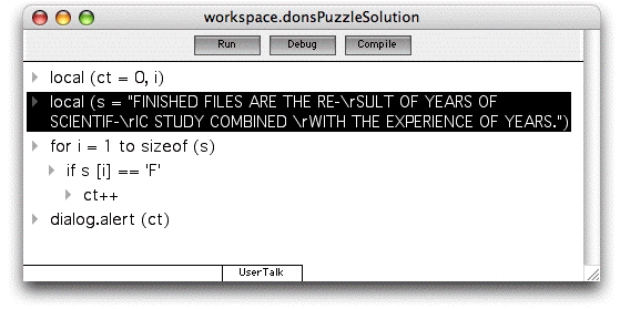 The thing is, why we need to be paying attention to this in the blogosphere, is that we're doing the same thing, all the time. We have all the trappings, the cameras, the mikes, the beautiful interviewers. And we make big deals out of little ones, and let crooks off the hook. We haven't started any real wars yet, but give us time, we're just getting warmed up. And maybe if we are somewhat aware of this, we can try to offset it with a little bit of humanity. Maybe someone can speak up for the poor schnook who gets caught in the gears of the blogger's fear. (Sorry for the pun.) Solution to Don's Amazing Puzzle There are six F's in the sentence. There is no catch. I found three. I went back and counted and recounted, and I was sure there were just three. So I wrote a script to see what was going on. It said there are six! Mystifying. Here's a screen shot of the script. I first ran it in DaveNet in 1997. It's usually fun. Only two people I knew back then got it right without any coaching. My uncle and Scott Rosenberg. Scott said his trick was to read the sentence backwards, something he learned as an editor at Salon. My uncle was an engineer at heart and loved puzzles. He just did what the puzzle told him to do, literally. Most people, myself included, don't. That's why it's an amazing puzzle. It teaches us about our ability to see what's right before our eyes. Don't feel bad if you got it wrong, you have a lot of company.