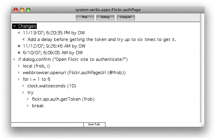 When I got to the bottom of the fix, figured out what they changed, and remembered how my code worked, it was easy to fix. But these were hours that I should have spent fixing other bugs, or creating new features for my users. I put it behind me until it happened again, today. Some code that had worked for a long time is now broken. I spent most of today trying to understand, again, what a token is and a frob and how they relate. I have to admit, that when I first implemented this code I didn't really understand what they these things are, but I fumbled around until the code worked and moved on. But now I'm back to where I was, and wondering whether there's any point in trying to fix this problem. How long before something else breaks? Right now I have a very small number of users, and most of them are not affected by these breaks. But what happens when there are more users, or something changes that breaks more of them. They're not going to be so understanding, I'm not going to be able to pass the buck. I'm going to be wrong, if that should happen, for choosing to build on Flickr. Is this really a position that Flickr wants to put us in??