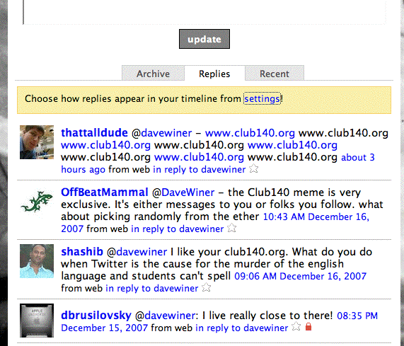 Bonjour mes amis! If you post a twit with my name in it following an at-sign that is exactly 140 characters in length, my little script will pick it up and add you Le Club 140. (Practicing my French!) For example... @davewiner, you are a very nice person and I enjoy sending you replies. I have actually nothing to say, but when has that stopped me before? If you posted that, your name would appear here... Of course you will be more original, won't you? Meanwhile, in other news, Club 140 has caused at least one person to swear off Twitter forever. Too bad so sad! :-( Normal life can now resume.