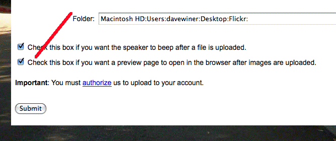 Future-safe archives in the Guardian Charles Arthur: "You can meet Major Olmsted in death as you could in life. The blog, and his site, is still there." Scoble checks in via Twittergram from CES. Prefs for Flickr desktop upload drop folder This morning a new feature for FlickrFan users. When you drop a picture into the desktop "drop folder" it's automatically uploaded to your Flickr account. Now you can set preferences for tags, the default description, access controls and content categories. Change Note #24: Upload defaults.
