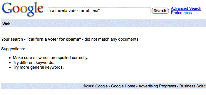 I'm a California voter for Obama I've got an Obama poster in the right margin of the home page of Scripting News. It'll stay there for the duration as a virtual equivalent of one of those signs people put on their front lawns. I live in California, one of the Super Tuesday states and I'm an Obama voter. That's what the poster means. Pass it on. After Google indexes Scripting News, this query will have exactly one match. Right now it has none. Let's load up Google with lots of blogs with Californians voting for Obama. And of course every other state in the union. PS: This is where I got the poster.