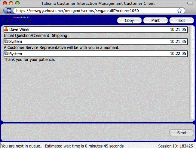 So now I'm on hold on chat to get an answer from NewEgg, since there's absolutely no way to get to a human on UPS. I figure since NewEgg has my money, they should be able to help me figure out what this means. Stay tuned. Of course their answer is to call UPS. Don't you love it when a vendor takes responsibility. (Not.) So NewEgg was no help, so I tried calling UPS for a second time, and this time I said "Representative" repeatedly to every prompt. And it worked. I got to talk to a human being. Maybe it's actually on the truck she said, but they're going to call me from San Pablo at noon to let me know what's going on. Stay tuned. Then I got an email from the NewEgg rep, who I had suggested should call UPS instead of me doing it, and guess what -- she did it! Amazing. Maybe there's hope. She said the UPS website was mistaken and the package is on the truck out for delivery and I should get it today. Maybe 2009 will be a great year. Stay tuned. BTW, I gave the NewEgg rep a link to this blog post so there's a chance they may read this or comment.