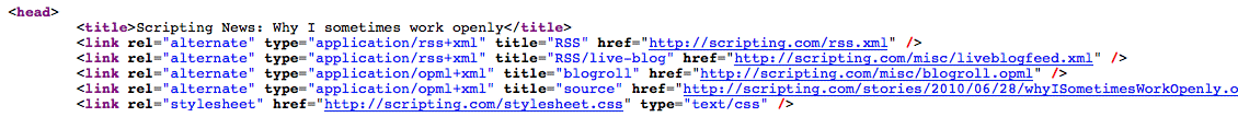 For example, if you do a View Source on this article you'll see a bunch of <link> elements in the head section of the document. They point at the source doe for the page, the RSS feed for the site, the RSS feed for the live/link-blog, the OPML source for the blogroll. There may be other things linked in there in teh future.