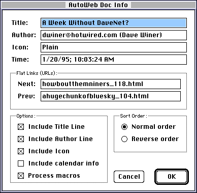 The Doc Info DialogFortunately, you don't have to know anything about these resources to edit the record. That's what the AutoWeb Doc Info dialog is for. Choose Document Options from the LittleScript menu in LSE. Here's what you'll see: