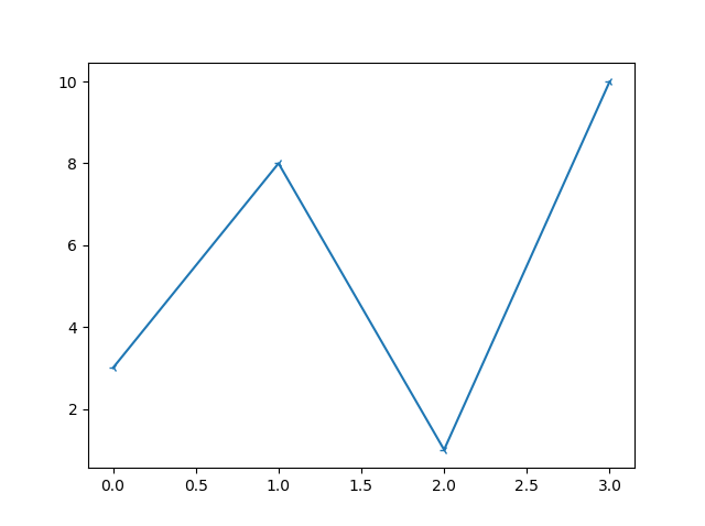 #Three lines to make our compiler able to draw: import sys import matplotlib matplotlib.use('Agg') import matplotlib.pyplot as plt import numpy as np ypoints = np.array([3, 8, 1, 10]) plt.plot(ypoints, marker = '3') plt.show() #Two lines to make our compiler able to draw: plt.savefig(sys.stdout.buffer) sys.stdout.flush()