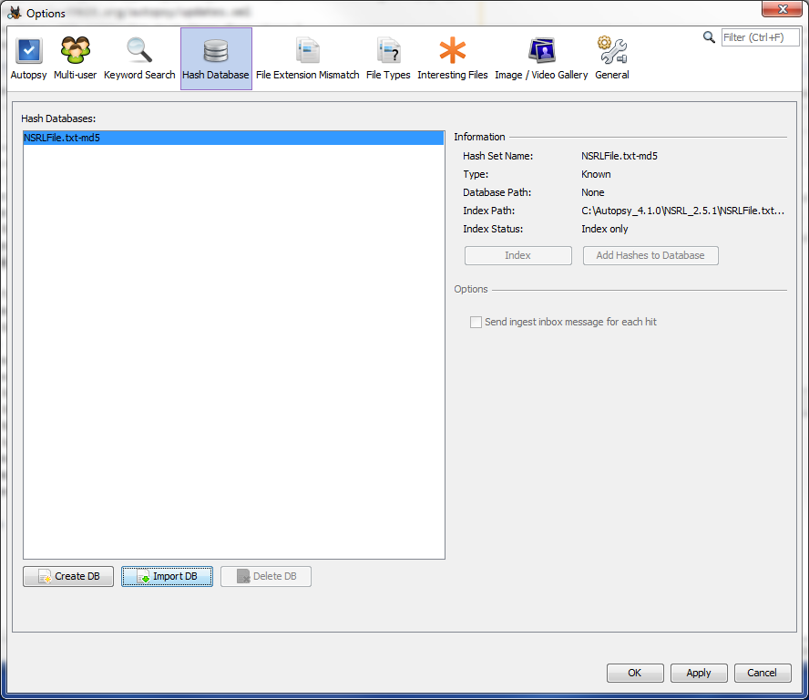 To use the NSRL, you may download a pre-made index from http://sourceforge.net/projects/autopsy/files/NSRL. Download the NSRL-XYZm-autopsy.zip (where 'XYZ' is the version number. As of this writing, it is 247) and unzip the file. Use the "Tools", "Options" menu and select the "Hash Database" tab. Click "Import Database" and browse to the location of the unzipped NSRL file. You can change the Hash Set Name if desired. Select the type of database desired, choosing "Send ingest inbox message for each hit" if desired, and then click "OK".